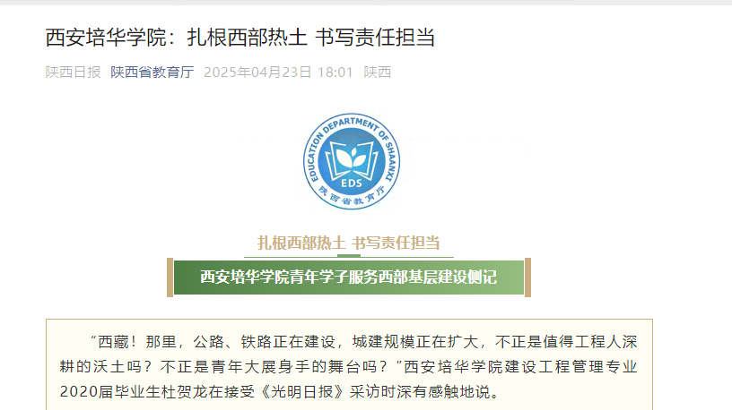 “西藏!那里,公路、铁路正在建设,城建规模正在扩大,不正是值得工程人深耕的沃土吗?不正是青年大展身手的舞台吗?”西安培华学院建设工程管理专业2020届毕业生杜贺龙在接受《光明日报》采访时深有感触地说。