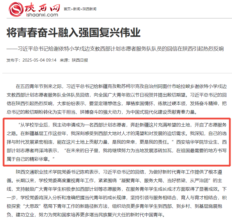 在五四青年节到来之际,习近平总书记给新疆克孜勒苏柯尔克孜自治州阿图什市哈拉峻乡谢依特小学戍边支教西部计划志愿者服务队全体队员回信,向全国广大青年致以节日祝贺并提出殷切期望。习近平总书记的回信在陕西引起热烈反响,大家纷纷表示,要坚定理想信念,厚植家国情怀,练就过硬本领,发扬奋斗精神,把总书记的殷切期盼转化为实干担当、拼搏奋斗的强大动力,为中国式现代化建设贡献青春力量。