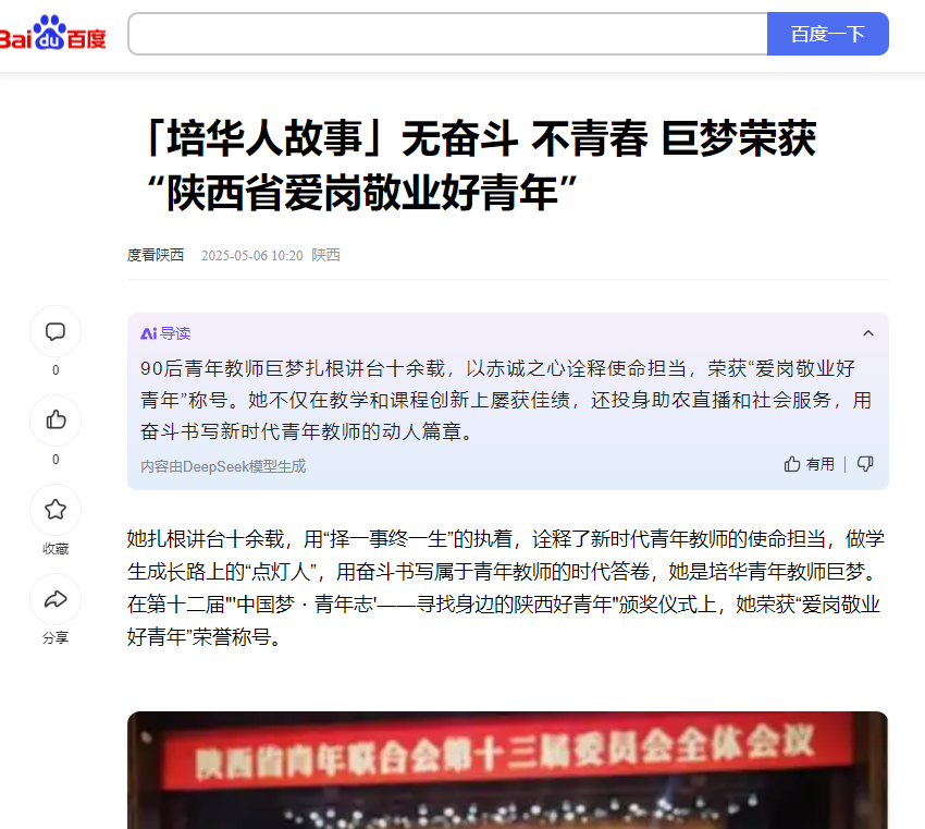 百度:「培华人故事」无奋斗 不青春 巨梦荣获“陕西省爱岗敬业好青年”