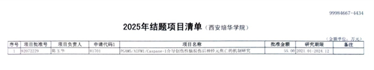 近日,西安培华学院科研工作迎来历史性突破——由陈玉华教授主持的国家自然科学基金面上项目《PGAM5/AIFM1/Caspase-1介导创伤性脑损伤后神经元焦亡的机制研究》(批准号82072229)通过国家自然科学基金委员会验收,顺利结题。这是学校首个成功结题的国家自然科学基金面上项目,标志着学校在高级别科研项目领域取得重大突破,为学科建设与科研发展注入强劲动力。