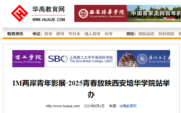 为加强与高校青年创作者的沟通,鼓励更多青年创作者用影像抒写青春年华,5月27日,由东南卫视、海峡卫视、平潭综合实验区党工委宣传与影视发展部主办,西安培华学院传媒与设计学院承办,影视戏剧系青蓝工作室协办的“IM两岸青年影展·2025青春放映”活动在汇知楼举办。广播电视编导专业教师索琼瑶、晋珊珊、王雪萍,计算机科学与技术专业教师、张涵参加了此次活动。活动由广播电视编导专业教师赵宇琛主持。