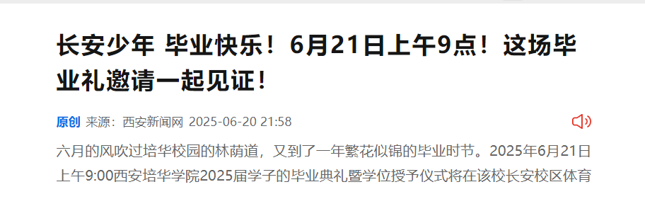 六月的风吹过培华校园的林荫道,又到了一年繁花似锦的毕业时节。2025年6月21日上午9:00西安培华学院2025届学子的毕业典礼暨学位授予仪式将在该校长安校区体育馆举行。