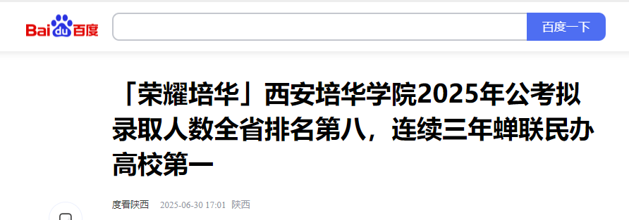 据6月20日有关单位发布的“2025年陕西公务员拟聘用人员毕业学校统计”显示,全省拟录用6659人,其中127人毕业于西安培华学院,拟录用人数位列全省高校第八位、民办高校第一位。据统计,2023年至2025年三年间,学校在全省录用公务员统一考试中录用人数分别位列全省第九、第七和第八,稳居同类院校第一位。