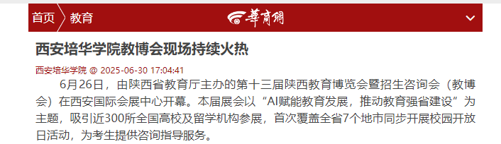 6月26日,由陕西省教育厅主办的第十三届陕西教育博览会暨招生咨询会(教博会)在西安国际会展中心开幕。本届展会以“AI赋能教育发展,推动教育强省建设”为主题,吸引近300所全国高校及留学机构参展,首次覆盖全省7个地市同步开展校园开放日活动,为考生提供咨询指导服务。