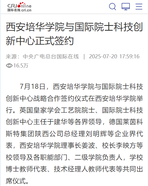 7月18日,西安培华学院与国际院士科技创新中心战略合作签约仪式在西安培华学院举行。英国皇家学会工艺院院士、国际院士科技创新中心主任于建华等各界领导,德国莱茵科斯特集团陕西公司总经理刘明辉等企业界代表,西安培华学院理事长姜波、校长李映方等校领导及各职能部门、二级学院负责人,学校博士教师代表、技术经理人教师代表等共同出席仪式。
