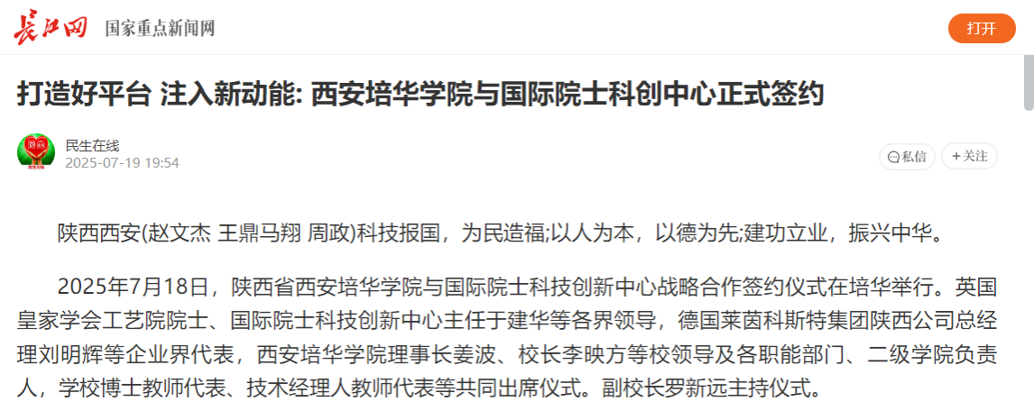 长江网:打造好平台 注入新动能:西安培华学院与国际院士科创中心正式签约
