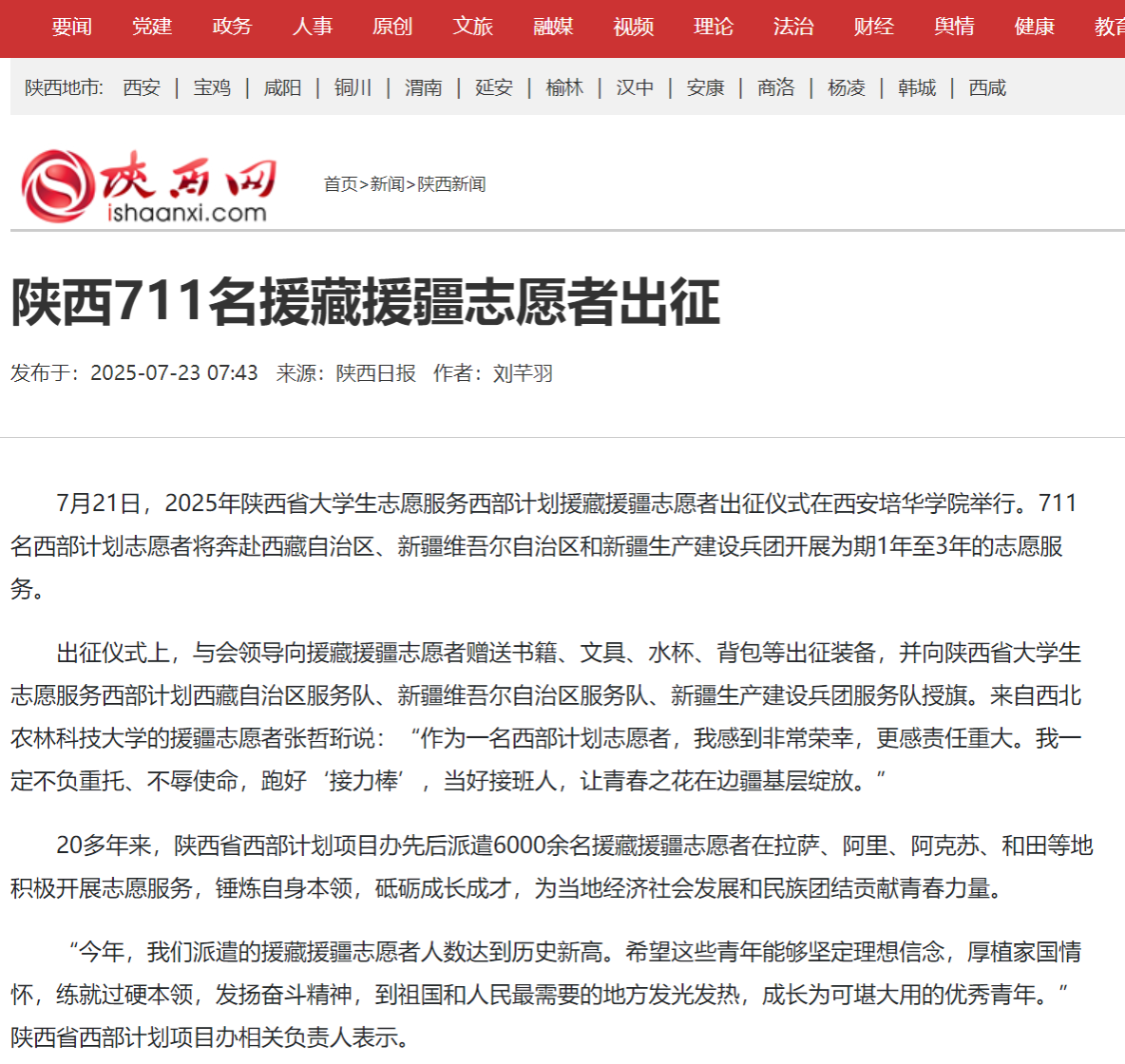 7月21日,2025年陕西省大学生志愿服务西部计划援藏援疆志愿者出征仪式在西安培华学院举行。711名西部计划志愿者将奔赴西藏自治区、新疆维吾尔自治区和新疆生产建设兵团开展为期1年至3年的志愿服务。