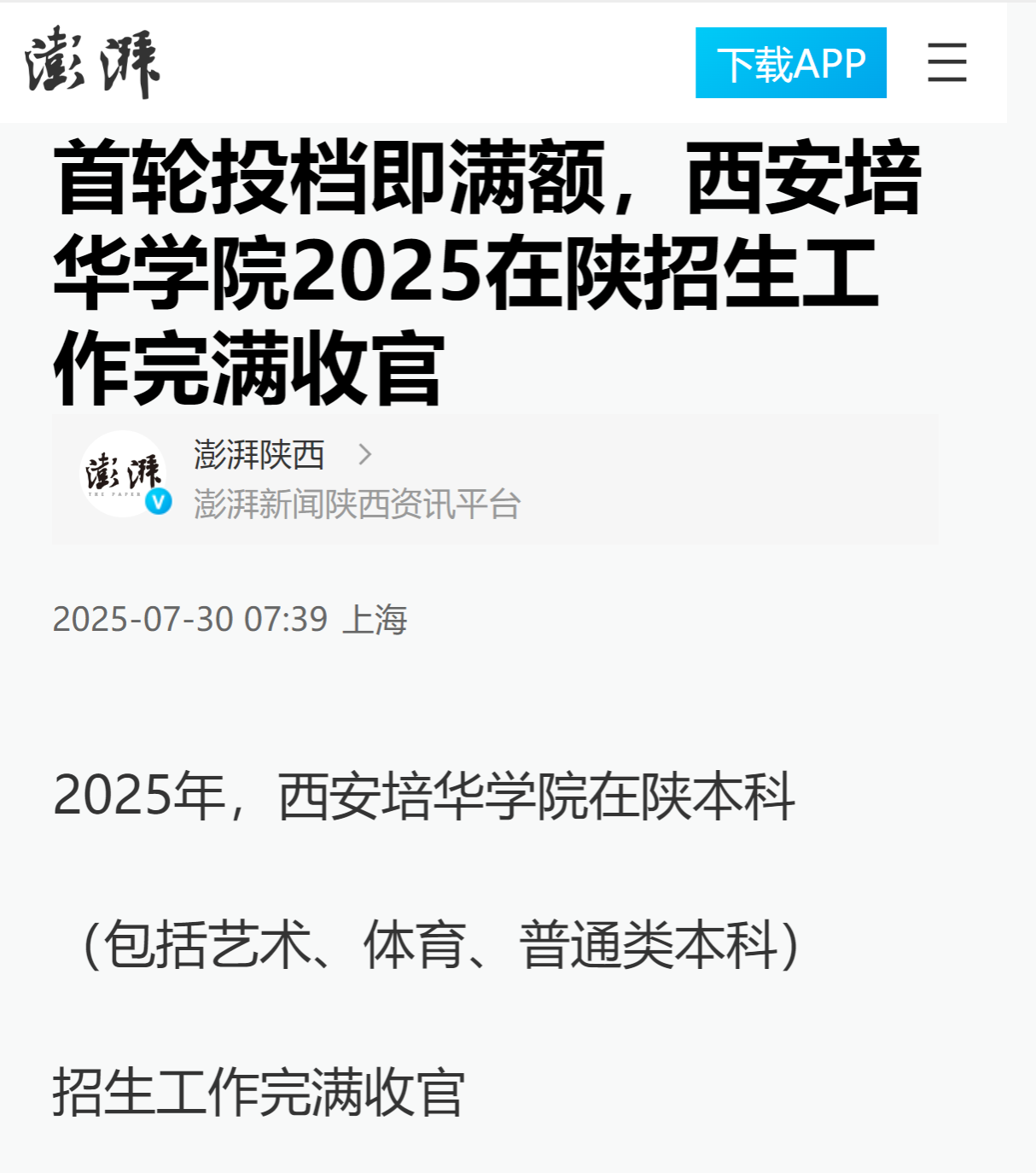 澎湃新闻:首轮投档即满额,西安培华学院2025在陕招生工作完满收官
