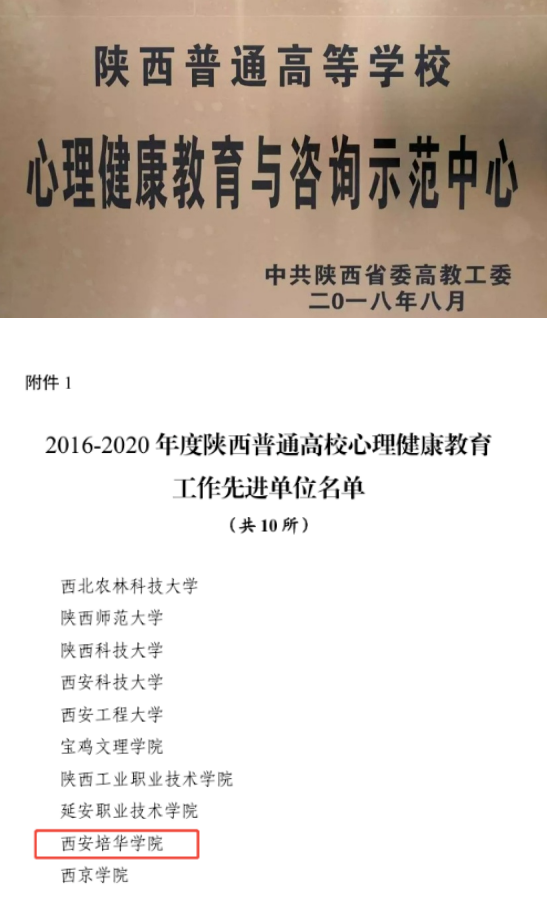 该中心是陕西省心理健康教育与咨询示范中心(A类),更在2021年示范中心复验中获评全省最高分。还多次被评为省级心理健康教育工作先进单位,曾被授予省级三星级(最高级)心灵驿站示范点、省级辅导员工作室——心灵花园工作室、省级生涯咨询特色工作室——眼界生涯工作室。它也是陕西省高校心理素质教育研究会副会长单位、全国心理委员工作协作组理事单位、民校生心理专业委员会主任委员单位、女性心理研究中心。