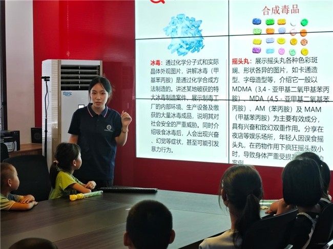 如果说《未成年人保护法》是温柔的守护,那么《中华人民共和国禁毒法》的宣讲则如同一声警钟。“大家看,这些五颜六色像糖果一样的东西,很可能就是伪装起来的毒品!”焦思睿通过展示仿真毒品模型和真实的案例届时毒品可怖的面孔,提高小朋友们对毒品的警惕性和防范意识。接着,她详细解读了法律条文,明确指出吸毒是违法行为,走私、贩卖、运输、制造毒品更是重罪,必将受到法律的严惩。并为孩子们讲述了虎门销烟的历史,让大家了解到中国禁毒的历史以及毒品对社会的严重危害。