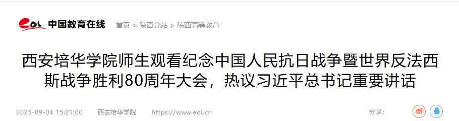 9月3日,纪念中国人民抗日战争暨世界反法西斯战争胜利80周年大会在北京天安门广场隆重举行。西安培华学院组织师生代表通过多种方式收看了大会直播盛况,共同见证了这一具有重大历史意义的时刻。