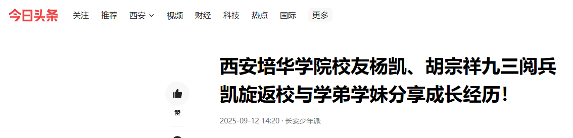 今日头条:西安培华学院校友杨凯、胡宗祥九三阅兵凯旋返校与学弟学妹分享成长经历!