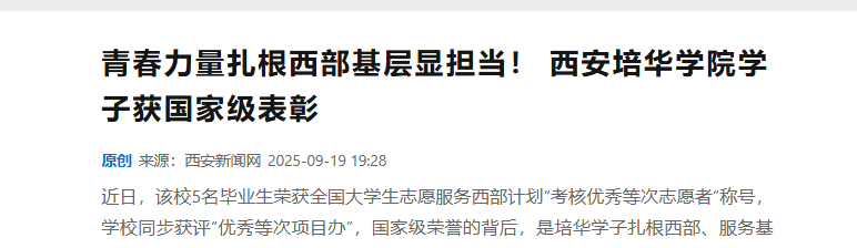 没有惊天动地的壮举,却有润物无声的坚守。这5名培华学子的故事,是无数西部计划志愿者的缩影——他们带着专业所长,怀揣热忱之心,在基层岗位上发光发热,用脚步丈量责任,用时间书写担当。“到西部去,到基层去”于他们而言,不是一句口号,而是一场跨越山海的青春远征,一次扎根大地、向阳生长的生命实践。