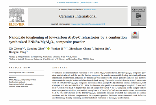 近日,西安培华学院智能科学与工程学院郑欣博士团队在国际材料领域SCIE期刊《Ceramics International》发表题为《Nanoscale toughening of low-carbon Al₂O₃-C refractories by a combustion synthesized BNNSs/MgAl₂O₄ composite powder》的学术论文。该期刊创刊于1971年,由Elsevier Ltd出版,在中国科学院分区中属材料科学大类2区,为材料科学权威Top期刊,影响因子5.6,是国际公认的材料科学权威刊物之一。
