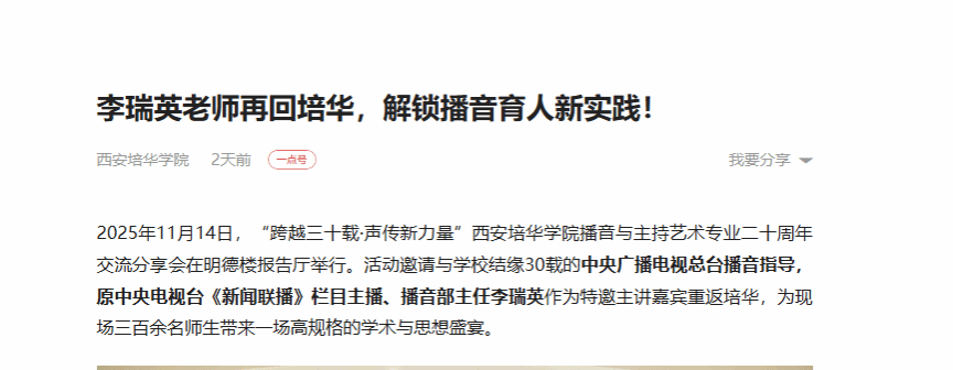 本次“跨越三十载·声传新力量”交流分享会,不仅是一次深情的历史回眸,更是一场指向未来的专业引领。李瑞英老师的再次莅临与倾情分享,为西安培华学院播音与主持艺术专业二十年的发展写下了浓墨重彩的一笔。活动现场,大师讲堂、示范教学、薪火展演等环节精彩纷呈,充分展现了培华播音与主持艺术专业的育人成果与蓬勃生机。这场高规格的讲座必将为专业的高质量发展注入强劲动能,激励全体师生在新起点上守正创新,砥砺前行。