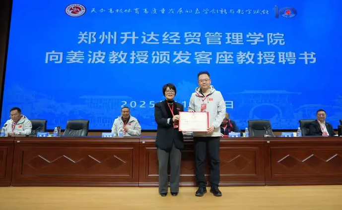 仪式现场,郑州升达经贸管理学院校长张欣与全国民办高校体育联盟理事长姜波博士互赠纪念品。这份互赠不仅承载着升达学院对联盟的诚挚谢意,更凝聚了双方深化合作、共促民办高校体育教育发展的美好愿景。
