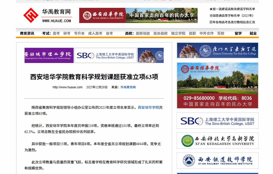 陕西省教育科学规划领导小组办公室公布的2025年度立项名单显示,西安培华学院共获准立项63项。