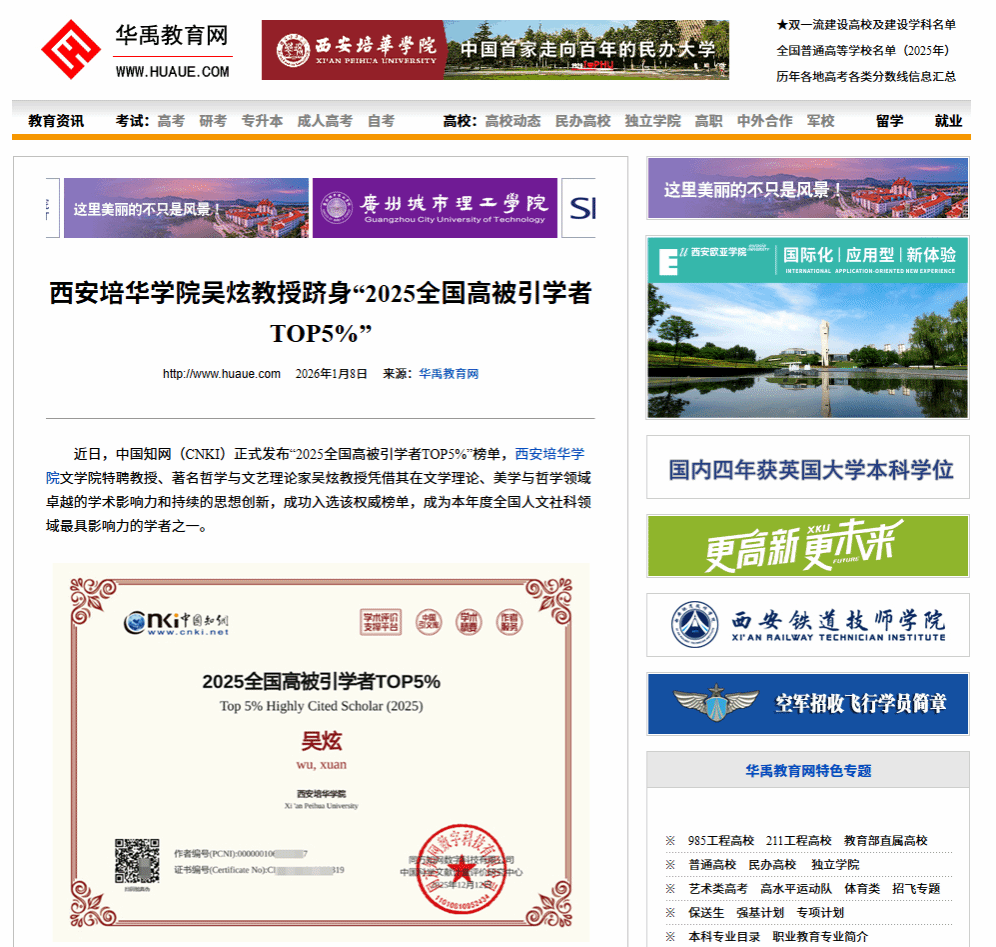 近日,中国知网(CNKI)正式发布“2025全国高被引学者TOP5%”榜单,西安培华学院文学院特聘教授、著名哲学与文艺理论家吴炫教授凭借其在文学理论、美学与哲学领域卓越的学术影响力和持续的思想创新,成功入选该权威榜单,成为本年度全国人文社科领域最具影响力的学者之一。