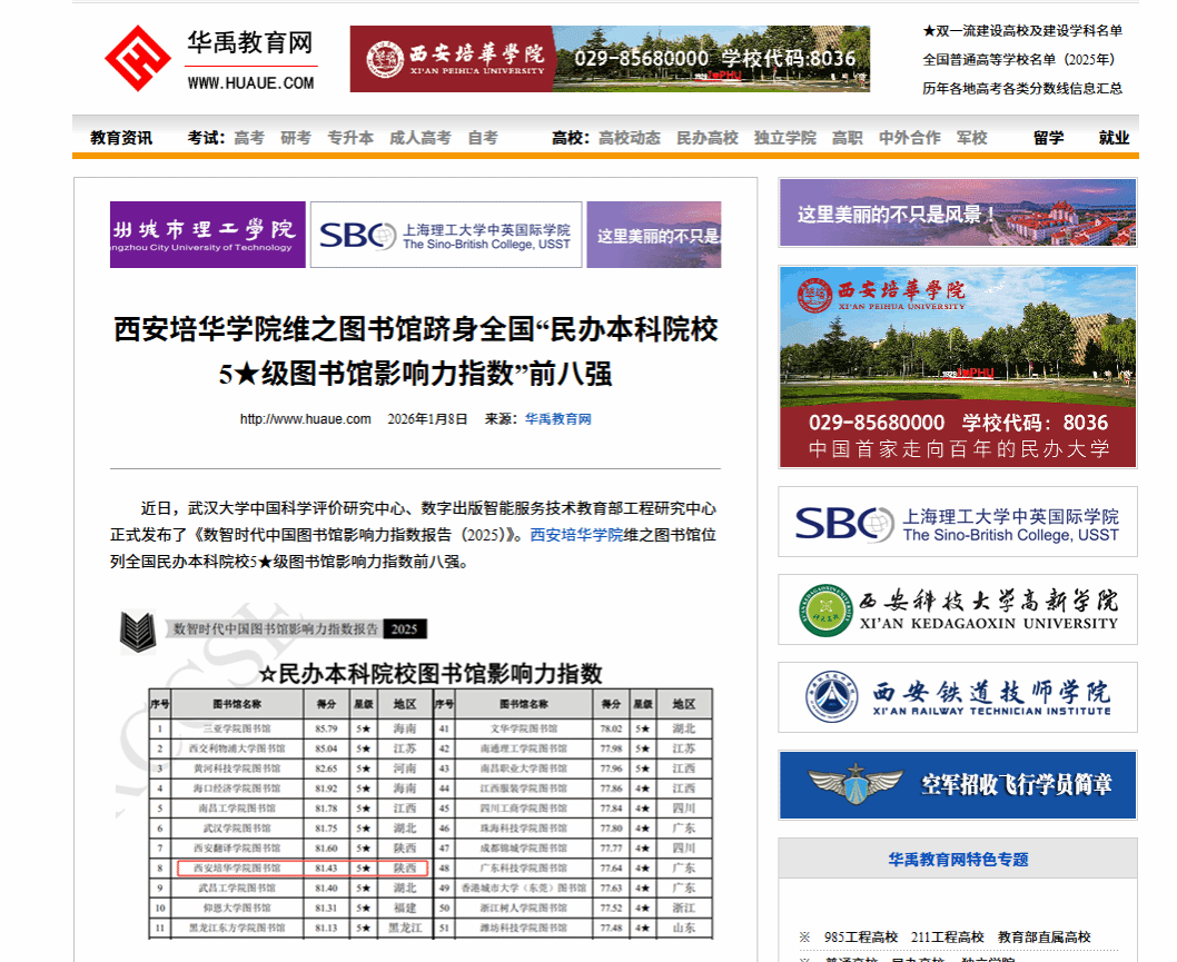 近日,武汉大学中国科学评价研究中心、数字出版智能服务技术教育部工程研究中心正式发布了《数智时代中国图书馆影响力指数报告(2025)》。西安培华学院维之图书馆位列全国民办本科院校5★级图书馆影响力指数前八强。