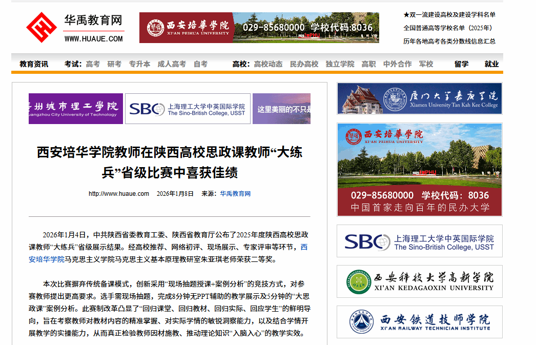 2026年1月4日,中共陕西省委教育工委、陕西省教育厅公布了2025年度陕西高校思政课教师“大练兵”省级展示结果。经高校推荐、网络初评、现场展示、专家评审等环节,西安培华学院马克思主义学院马克思主义基本原理教研室朱亚琪老师荣获二等奖。