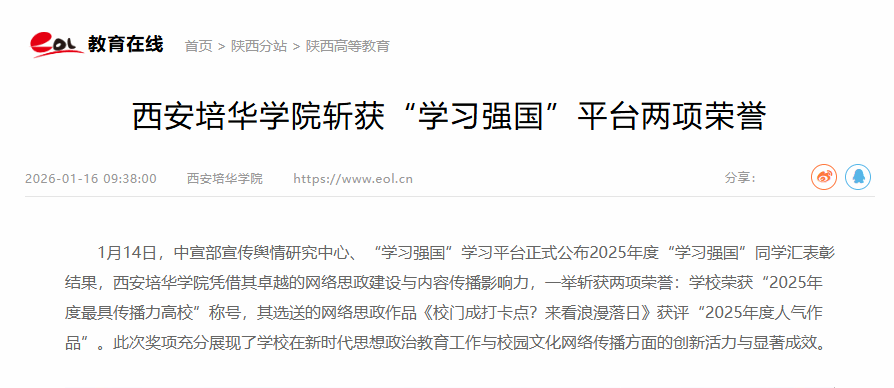 1月14日,中宣部宣传舆情研究中心、“学习强国”学习平台正式公布2025年度“学习强国”同学汇表彰结果,西安培华学院凭借其卓越的网络思政建设与内容传播影响力,一举斩获两项荣誉:学校荣获“2025年度最具传播力高校”称号,其选送的网络思政作品《校门成打卡点?来看浪漫落日》获评“2025年度人气作品”。此次奖项充分展现了学校在新时代思想政治教育工作与校园文化网络传播方面的创新活力与显著成效。