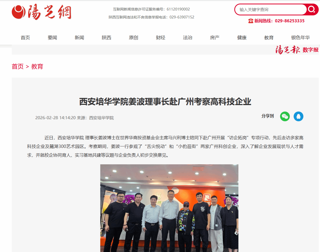 近日,西安培华学院 理事长姜波博士在世界华商投资基金会主席马兴利博士陪同下赴广州开展“访企拓岗”专项行动,先后走访多家高科技企业及麓湖300艺术园区。考察期间,姜波一行参观了“舌尖悦动”和“小豹逛街”两家广州科创企业,深入了解企业发展现状与人才需求,并就校企协同育人、实习基地共建等议题与企业负责人初步交换意见。
