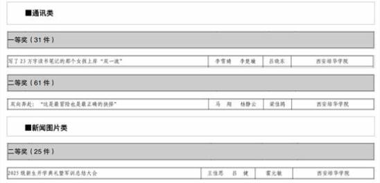近日,2025年度“陕西高校新闻奖”评选结果正式揭晓,西安培华学院共有3件作品脱颖而出,揽获一等奖1项、二等奖2项。这一优异成果,既彰显了学校在新闻宣传工作中的扎实积淀,也展现了其在传递校园资讯、弘扬校园文化方面的卓越成效。