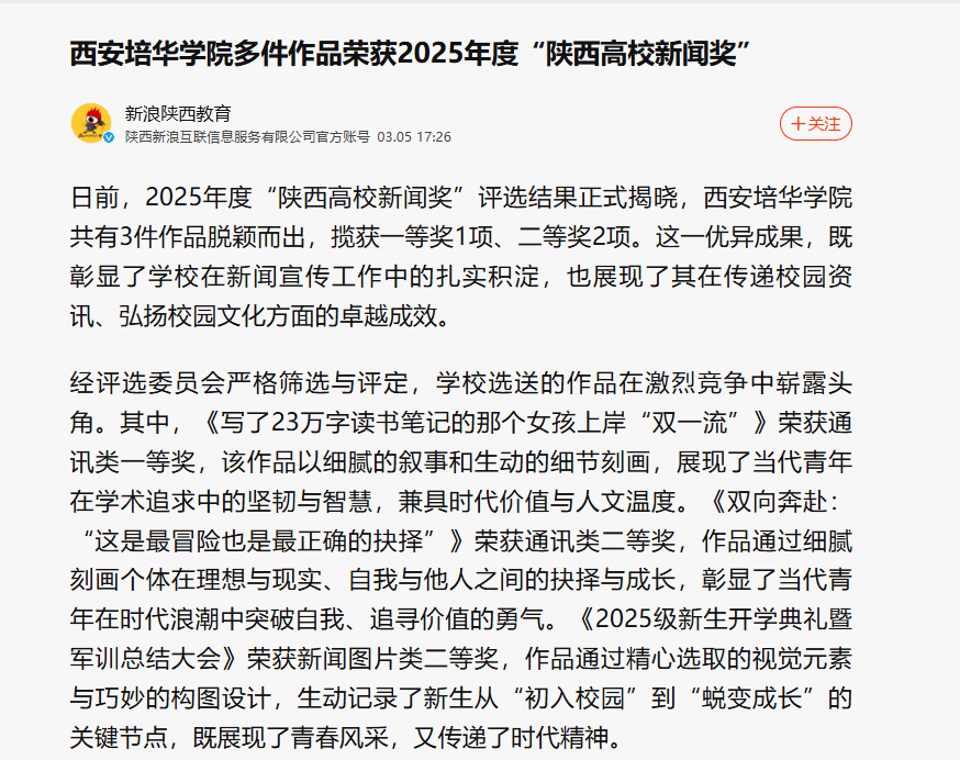 新浪新闻:西安培华学院多件作品荣获2025年度“陕西高校新闻奖”