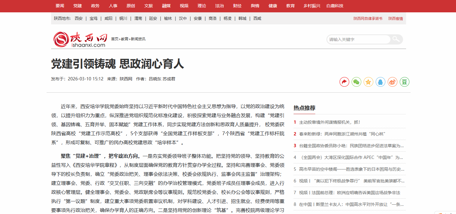 下一步,西安培华学院将持续深化党建品牌化和思政成果项目化建设,聚焦新时代民办高校党建思政高质量发展,进一步完善治理体系、提升组织力、创新育人模式、强化数字赋能,不断把政治优势、组织优势转化为办学优势、发展优势,努力建设党建引领有力、思政特色鲜明、办学质量一流的百年民办名校,为培养担当民族复兴大任的时代新人作出更大贡献。