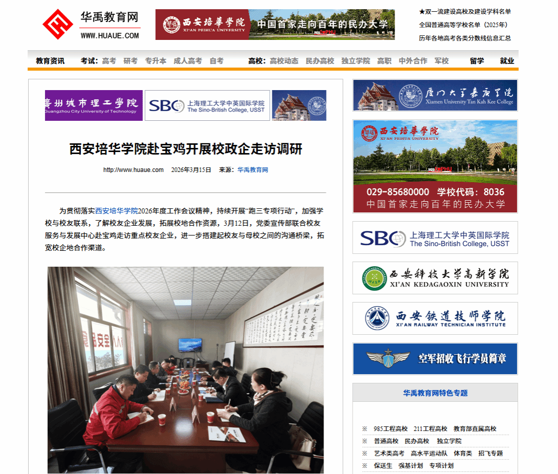 为贯彻落实西安培华学院2026年度工作会议精神,持续开展“跑三专项行动”,加强学校与校友联系,了解校友企业发展,拓展校地合作资源,3月12日,党委宣传部联合校友服务与发展中心赴宝鸡走访重点校友企业,进一步搭建起校友与母校之间的沟通桥梁,拓宽校企地合作渠道。
