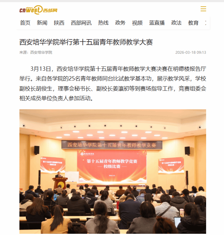 3月13日,西安培华学院第十五届青年教师教学大赛决赛在明德楼报告厅举行。来自各学院的25名青年教师同台比试教学基本功,展示教学风采,学校副校长胡俊生,理事会秘书长、副校长姜瀛初等到赛场指导工作,竞赛组委会相关成员单位负责人参加活动。