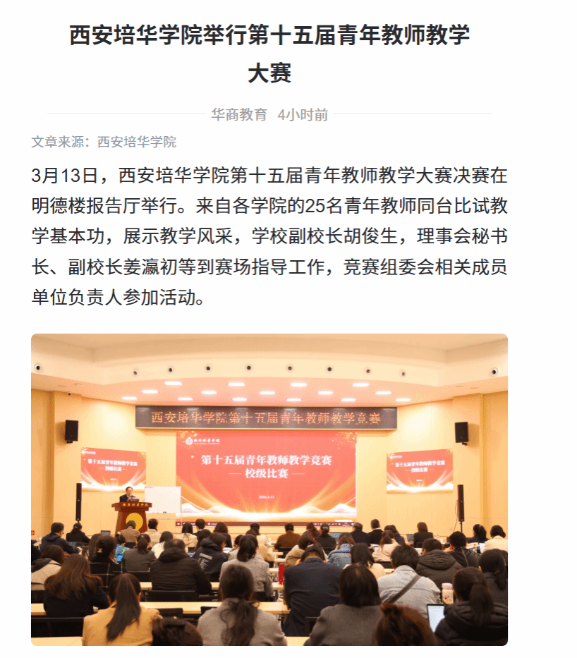 3月13日,西安培华学院第十五届青年教师教学大赛决赛在明德楼报告厅举行。来自各学院的25名青年教师同台比试教学基本功,展示教学风采,学校副校长胡俊生,理事会秘书长、副校长姜瀛初等到赛场指导工作,竞赛组委会相关成员单位负责人参加活动。