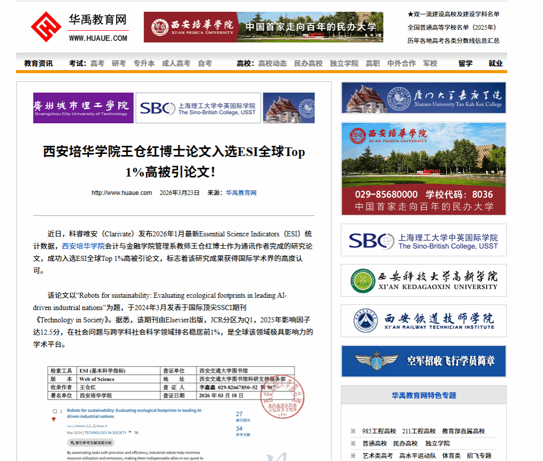 华禹教育网:西安培华学院王仓红博士论文入选ESI全球Top 1%高被引论文!