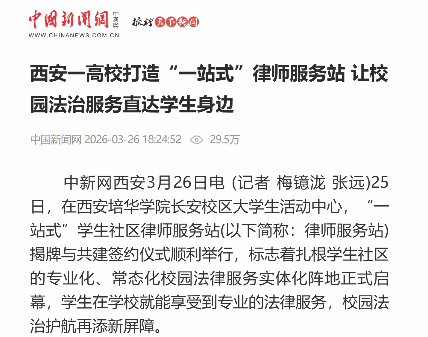 中新网西安3月26日电 (记者 梅镱泷 张远)25日,在西安培华学院长安校区大学生活动中心,“一站式”学生社区律师服务站(以下简称:律师服务站)揭牌与共建签约仪式顺利举行,标志着扎根学生社区的专业化、常态化校园法律服务实体化阵地正式启幕,学生在学校就能享受到专业的法律服务,校园法治护航再添新屏障。