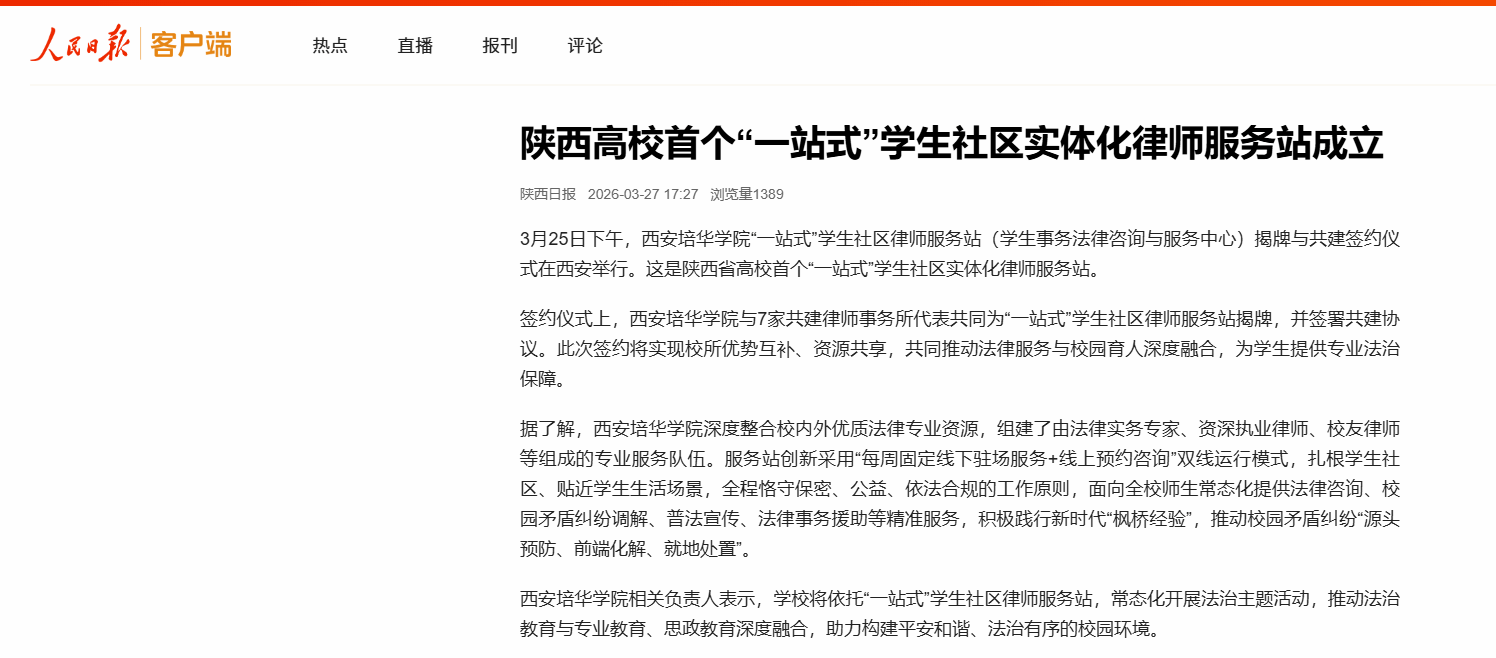 西安培华学院相关负责人表示,学校将依托“一站式”学生社区律师服务站,常态化开展法治主题活动,推动法治教育与专业教育、思政教育深度融合,助力构建平安和谐、法治有序的校园环境。