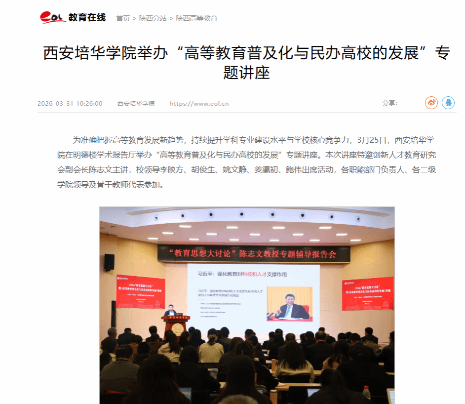 为准确把握高等教育发展新趋势,持续提升学科专业建设水平与学校核心竞争力,3月25日,西安培华学院在明德楼学术报告厅举办“高等教育普及化与民办高校的发展”专题讲座。本次讲座特邀创新人才教育研究会副会长陈志文主讲,校领导李映方、胡俊生、姚文静、姜瀛初、鲍伟出席活动,各职能部门负责人、各二级学院领导及骨干教师代表参加。