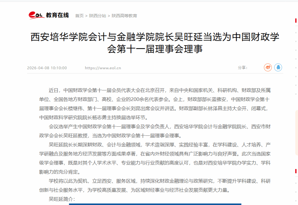 吴旺延院长长期深耕财政、会计与金融领域,学术造诣深厚、实践经验丰富,在学科建设、人才培养、产学研融合及服务地方经济发展等方面成果卓著,在省内外财经领域具有广泛影响力与良好声誉。此次当选国家级学会理事,既是对其个人学术水平、专业能力与行业贡献的高度认可,也是对西安培华学院办学实力、学科影响力的充分肯定。