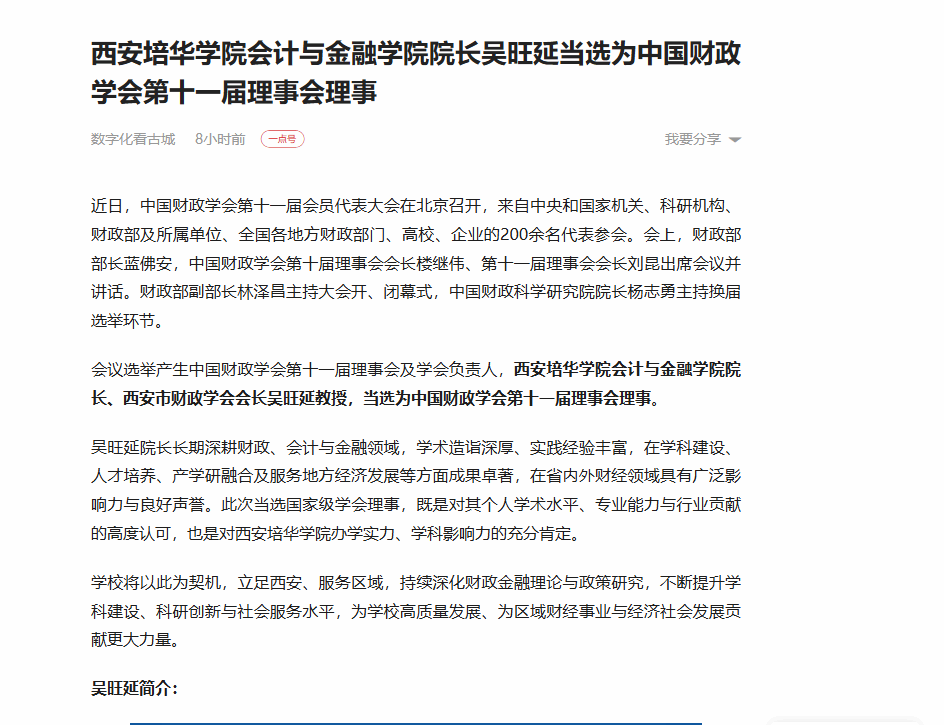 一点资讯:西安培华学院会计与金融学院院长吴旺延当选为中国财政学会第十一届理事会理事