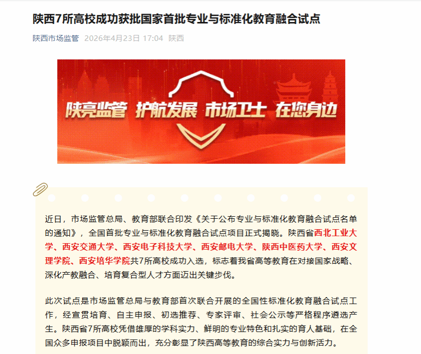 近日,市场监管总局、教育部联合印发《关于公布专业与标准化教育融合试点名单的通知》,全国首批专业与标准化教育融合试点项目正式揭晓。陕西省西北工业大学、西安交通大学、西安电子科技大学、西安邮电大学、陕西中医药大学、西安文理学院、西安培华学院共7所高校成功入选,标志着我省高等教育在对接国家战略、深化产教融合、培育复合型人才方面迈出关键步伐。