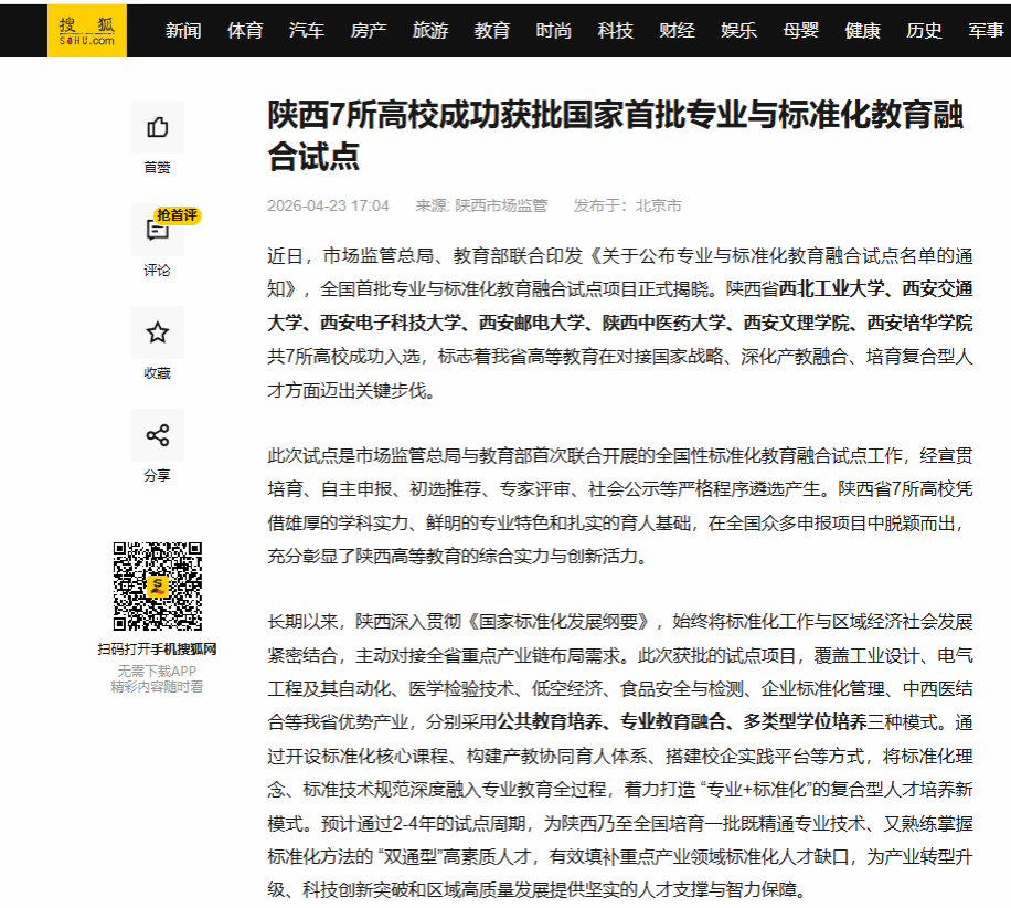 搜狐新闻:陕西7所高校成功获批国家首批专业与标准化教育融合试点