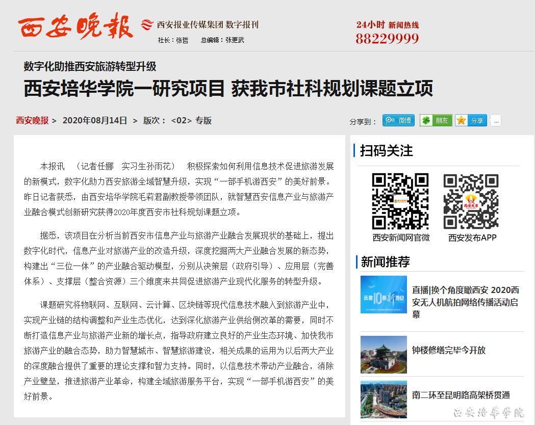本报讯 (记者任娜 实习生孙雨花) 积极探索如何利用信息技术促进旅游发展的新模式,数字化助力西安旅游全域智慧升级,实现“一部手机游西安”的美好前景。昨日记者获悉,由西安培华学院毛莉君副教授带领团队,就智慧西安信息产业与旅游产业融合模式创新研究获得2020年度西安市社科规划课题立项。