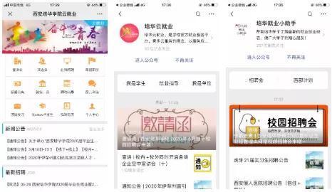 开启“云就业”,夯实平台保障。疫情发生后,学校即刻开启“云就业”服务平台,开通“云就业”微信服务号。通过西安培华学院云就业信息网、“培华云就业”微信服务号、“就业小助手”微信订阅号、就业工作微信群、毕业生QQ\微信群、短信等线上平台,实现就业指导与推荐服务信息“全程化、精准化、高效化”推送。