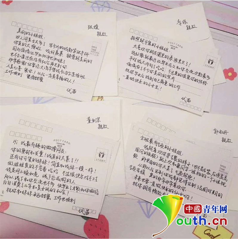 “我们专业的人都比较内向,女生也多,大家都不善言辞,平时作业老师也会要求我们写点东西,大家也都有表达欲,所以选择用书信的方式聊天。”一位同学、一张明信片、一段青春故事、一份最美好的祝福,组成了最美好的大学记忆,代苗把她与每一位同学的故事写在明信片上,用漂亮的信封装起来,送给班里的同学。