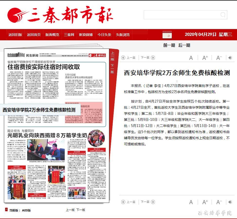 本报讯 (记者 李佳)4月27日西安培华学院首批学子返校,在返校准备工作中,包括校方为全校2万余名师生免费做核酸检测。