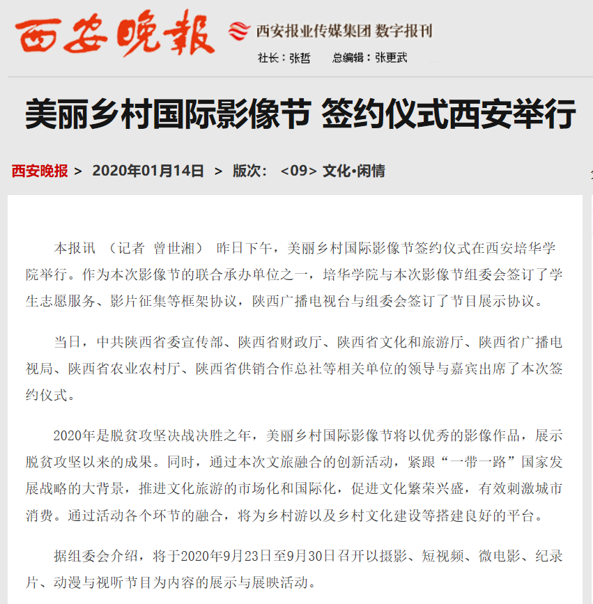 本报讯 (记者 曾世湘) 昨日下午,美丽乡村国际影像节签约仪式在西安培华学院举行。作为本次影像节的联合承办单位之一,培华学院与本次影像节组委会签订了学生志愿服务、影片征集等框架协议,陕西广播电视台与组委会签订了节目展示协议。