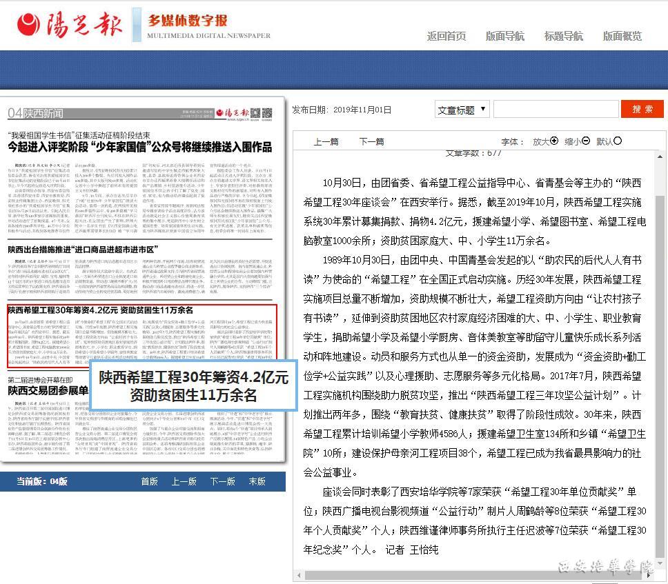10月30日,由团省委、省希望工程公益指导中心、省青基会等主办的“陕西希望工程30年座谈会”在西安举行。据悉,截至2019年10月,陕西希望工程实施系统30年累计募集捐款、捐物4.2亿元,援建希望小学、希望图书室、希望工程电脑教室1000余所;资助贫困家庭大、中、小学生11万余名。