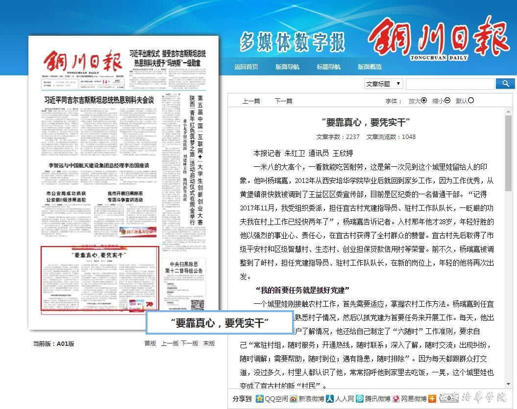今年4月,杨瑞嘉被组织派到了屽村。这个村子比较大,不仅有着4千余名村民,村子情况也十分复杂。一到村上,他就走访入户了解情况,化解矛盾,不到一个月,他便积极协调了5万元资金修缮道路,干练的他立刻得到了屽村村民的认可。“面对新的挑战,我坚信组织对我的信任,我也会更加努力,勇担重任,带领乡亲们走上富裕道路。”杨瑞嘉说道。来源:铜川日报,6月14日,A1版