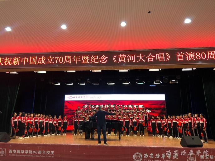 2019年4月13日由西安培华学院举办的“庆祝新中国成立70周年暨《黄河大合唱》首演80周年”活动顺利举办,100余名培华师生在校园里唱响《黄河大合唱》,“通过演唱这首歌,其实也是一种爱国主义教育,能让更多的90后、00后更了解历史,对革命先烈们更加崇敬,懂得现在来之不易的新生活。”担任本次大合唱指挥的培华人文与国际教育学院辅导员栾博强介绍到。