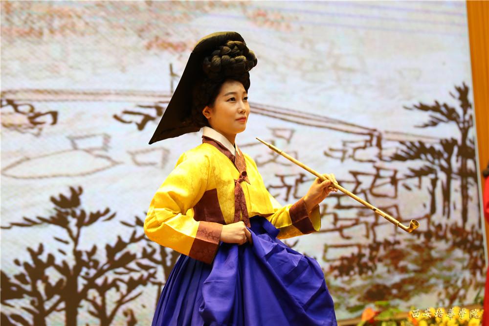 在随后进行的专家主题宣讲环节,韩服文化事业团朴民在代表作了以“鉴赏18世纪出土的两班服饰”为主题的报告。韩国成均馆大学赵又玄教授作了以“申润福和金洪道的风俗画-18世纪士大夫和妓女服饰”为主题的报告。西安培华学院李媛教授作了以“明朝时期服饰特点-汉族服饰的艳丽余晖”为主题的报告。西安培华学院牛菲教授作了以“明代传统服饰形象在当代影视剧中的再造研究”为主题的报告。专家教授们通过图片解析、实物展示等方式,从不同角度入手,全面深刻解析了不同历史时期传统服饰特点,带领在场观众充分领悟中韩传统服饰的魅力。