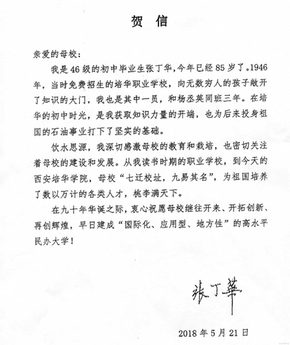 5月21日,中华全国总工会原党组书记、副主席、书记处第一书记,培华46级校友张丁华老人,在北京为母校培华90周年校庆写了一封贺信,表达了老人72年以来,深藏在心底对母校的感恩之情和殷切期望。